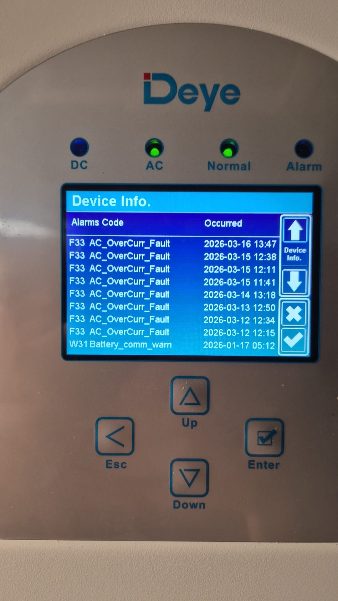 | Catatan model Artikel ini menggunakan F33 dalam pengertian yang ditemukan dalam manual Deye di mana F33 ditetapkan sebagai gangguan arus lebih AC. Pada beberapa rangkaian produk lainnya, alarm sisi AC yang setara mungkin muncul di bawah nomor kode terdekat. Logika diagnostiknya secara umum tetap sama. |